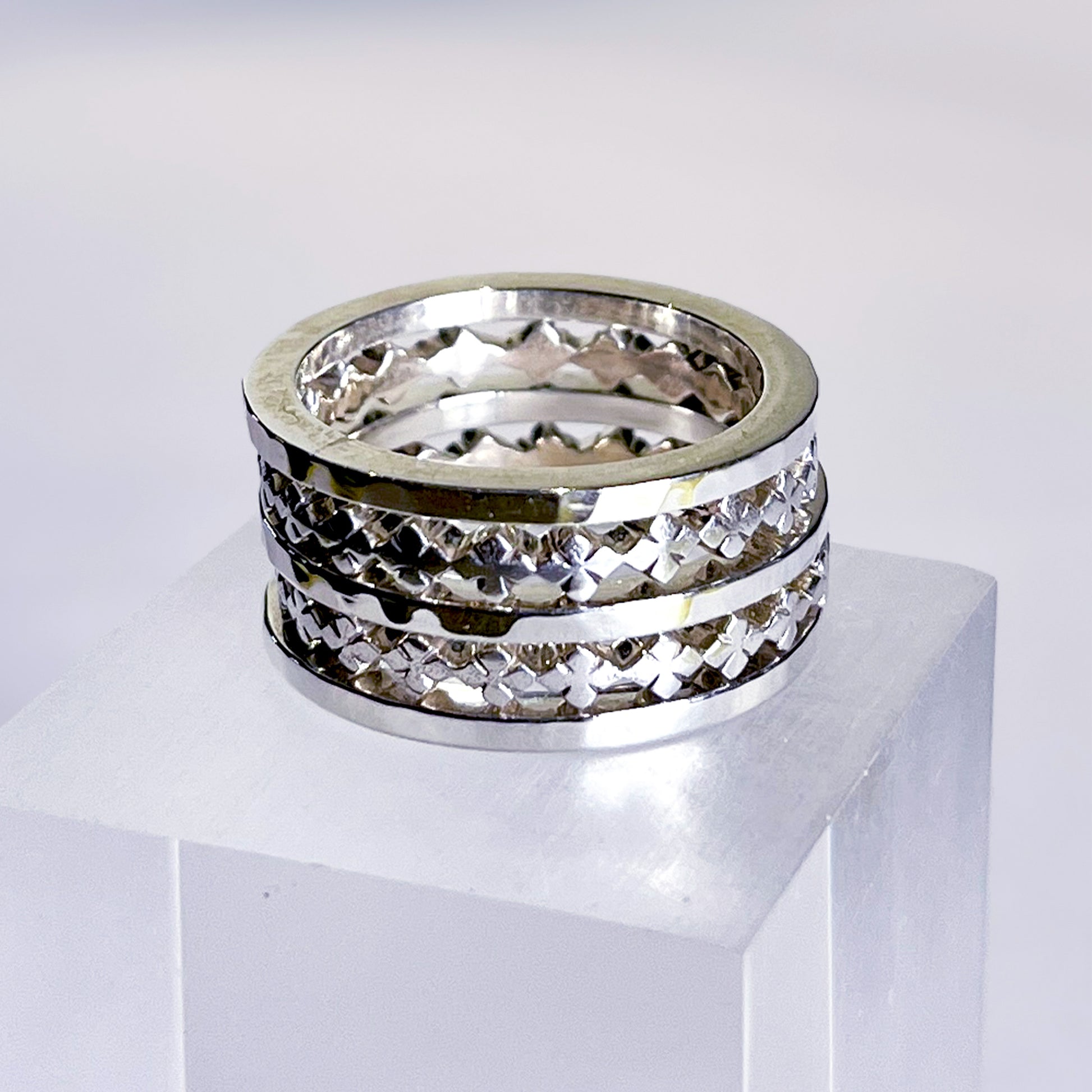 Luo oma ainutlaatuinen tyylisi tällä upealla käsintehdyllä hopeisella yhdistelmäsormuksella. Sormus koostuu viidestä erillisestä sormuksesta. Yhdistele mielesi mukaan luodaksesi juuri sinulle täydellisen ilmeen.