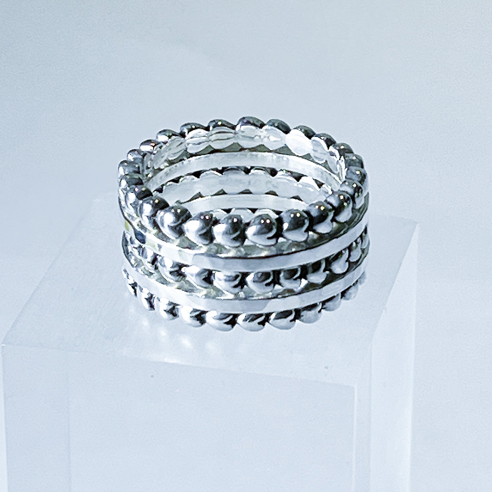 Luo oma ainutlaatuinen tyylisi tällä upealla käsintehdyllä hopeisella yhdistelmäsormuksella. Sormus koostuu viidestä erillisestä sormuksesta. Yhdistele mielesi mukaan luodaksesi juuri sinulle täydellisen ilmeen.